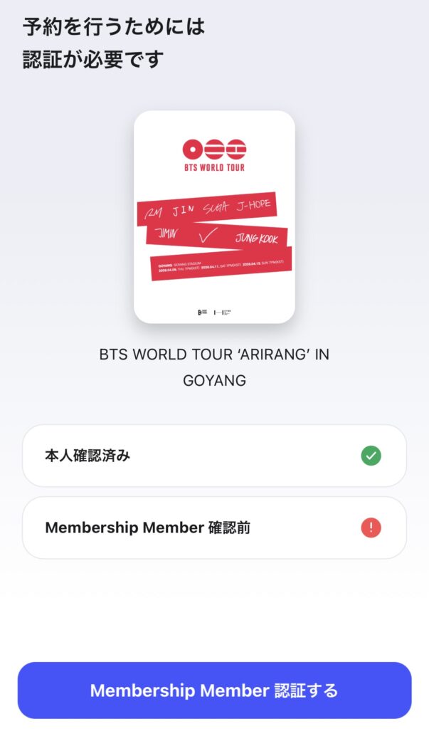 BTS韓国公演のチケットを「ファンクラブ先行予約(ARMY MEMBERSHIP PRESALE)」で購入するためには、「事前認証(Pre-verification)」という非常に重要なステップが必要です。
